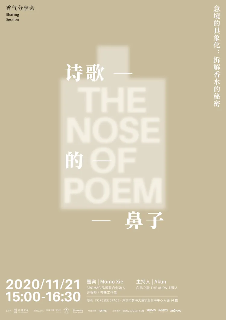 11月21日(周六),FORESEE将邀请香水品牌AROMAG联合创始人、知乎香水话题优秀回答者摸摸谢(Momo Xie),以诗的意向为切入点,和你一起拆解香水的制作,聊聊味道如何以抽象的形态,实现具象的表达。
