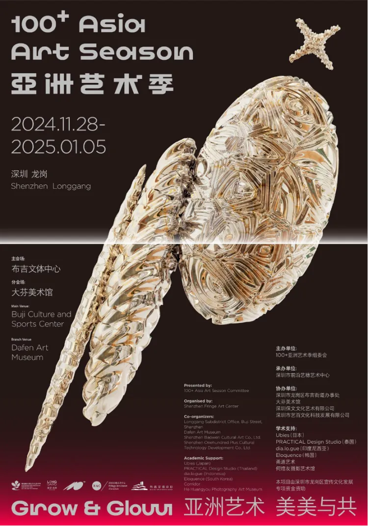 首届【100+ 亚洲艺术季】于深圳市龙岗区举办,共设两个展场,分别为主展场布吉文体中心及分展场大芬美术馆,同期举办多个论坛及活动,架构链接产业资源。100+ 亚洲艺术季活动时间自2024年11月28日起至2025年1月5日,部分展览活动将延续至2025年1月末(具体活动时间见下)。