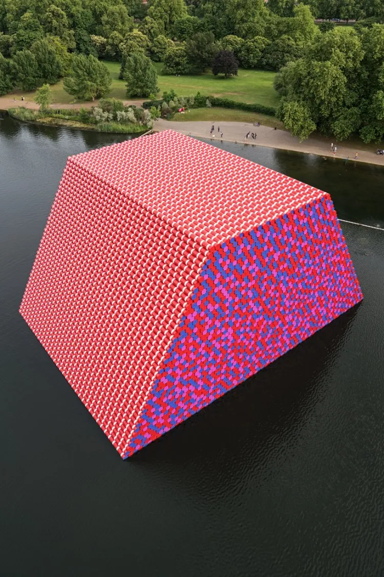 初次亮相是在2018年,《伦敦马斯塔巴》漂浮在海德公园的蛇形湖上,这个由数千个堆起来的桶组成的大型装置艺术品,和埃及的狮身人面像一样高,重约650吨,非常壮观。但可惜的是,这个作品只是临时地漂浮在湖面上,错过一次,也许就是终生遗憾。