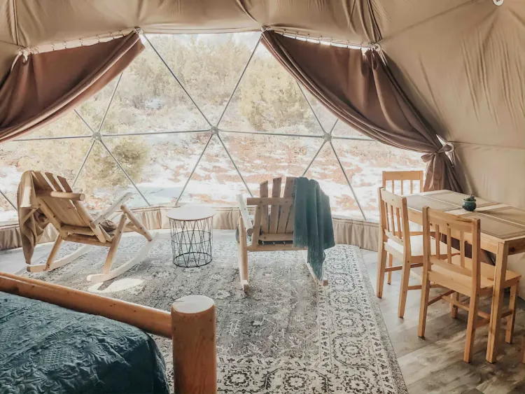 家具全部取材自本地的,粗粝的木头与编织地毯带来了西部风情。如果你喜欢大量的徒步旅行,攀登和冒险,这里就是你的胜地。远离都市的喧嚣,在荒漠里找到久违的自己。