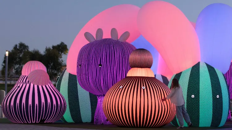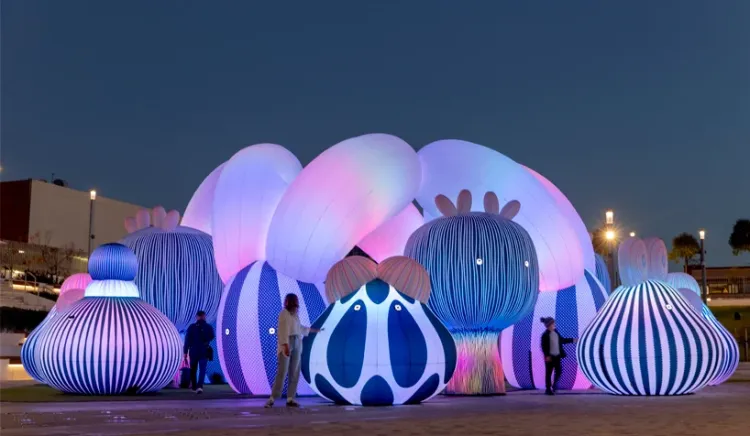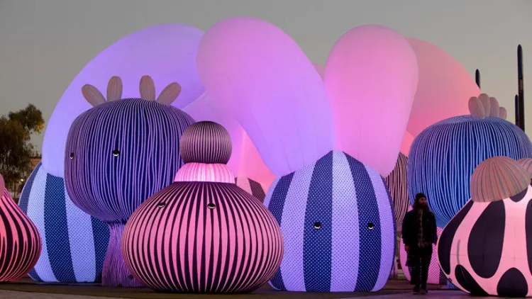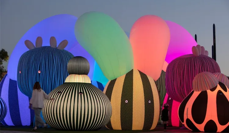 这16个充气装置占地超过500平方米,用不同的声音与光影营造出一个充满童趣的环境里。16种不同的光就像一场不间断的光影秀。而声音也是采用了极简的风格,通过程序巧妙配合,让观众无论是在白天还是黑夜,都能够感受到同步的声光电所带来的美学动态冒险。