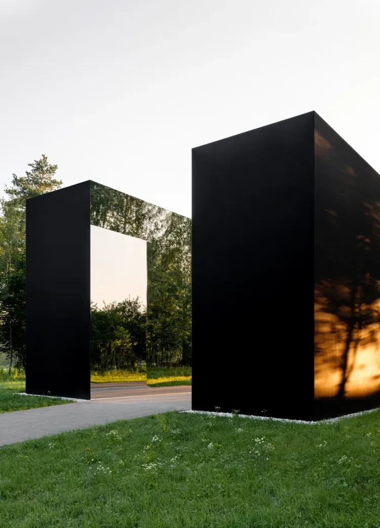 他还在设计中引入了两面由抛光不锈钢制成的落地镜。这个镜子是由艺术家工作室研发制作的,制作的钢板在俄罗斯几乎没有类似,而表面抛光是通过最高水平的工艺实现的。工业生产对传统生活方式的入侵不可否认破坏了自然中的统一,而在这样一个自然环境中介入一种难以忽视的现代工艺,会给到访者带来一种关于传统与现代、自然资源和人类文明的矛盾关系,更为立体的思考。