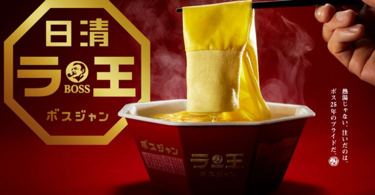日清拉王系列产品和三得利的Boss咖啡是同年推出的,于是二者25周年庆的时候,他们一拍即合,联合推出了一款——泡面外套。