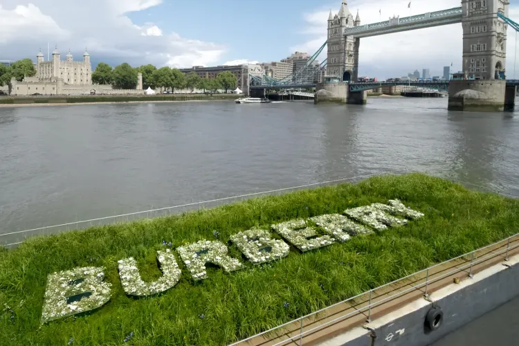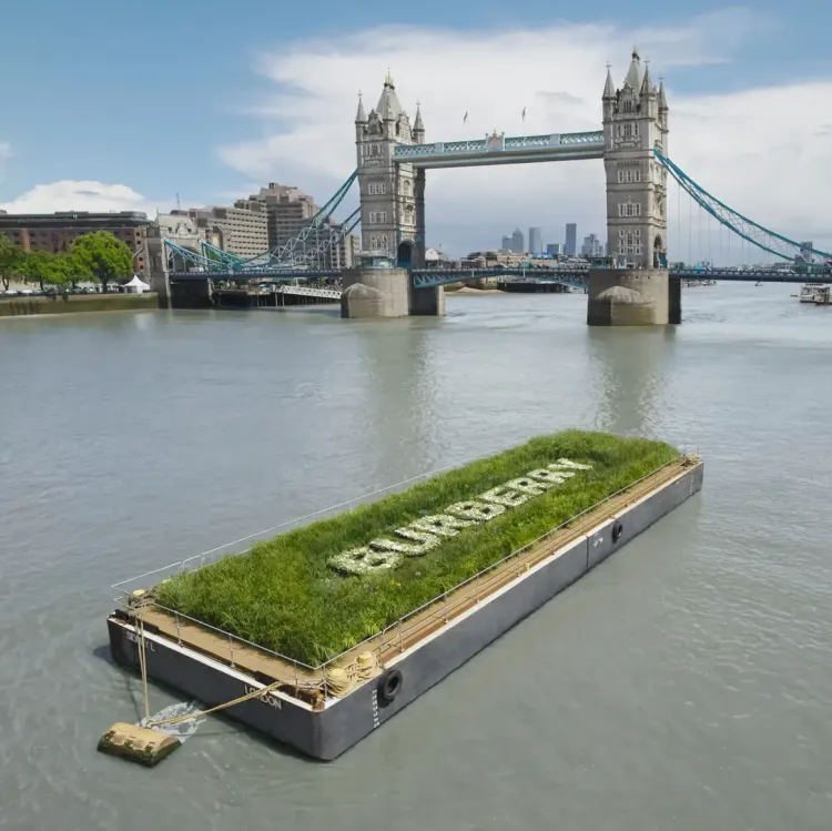 首先,以「顶级绽放」(Super Bloom)为主题推出了两处户外装置艺术。一是泰晤士河上、伦敦塔桥附近飘着一块有“Burberry”字样的漂浮草地,由5000多种植物组成的草地代表了英国河流生态系统,此举强调了生物多样性对世界的重要意义,授粉者和植物、动植物之间的平衡关系。