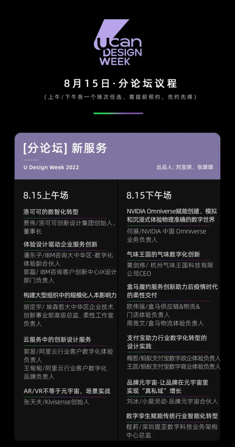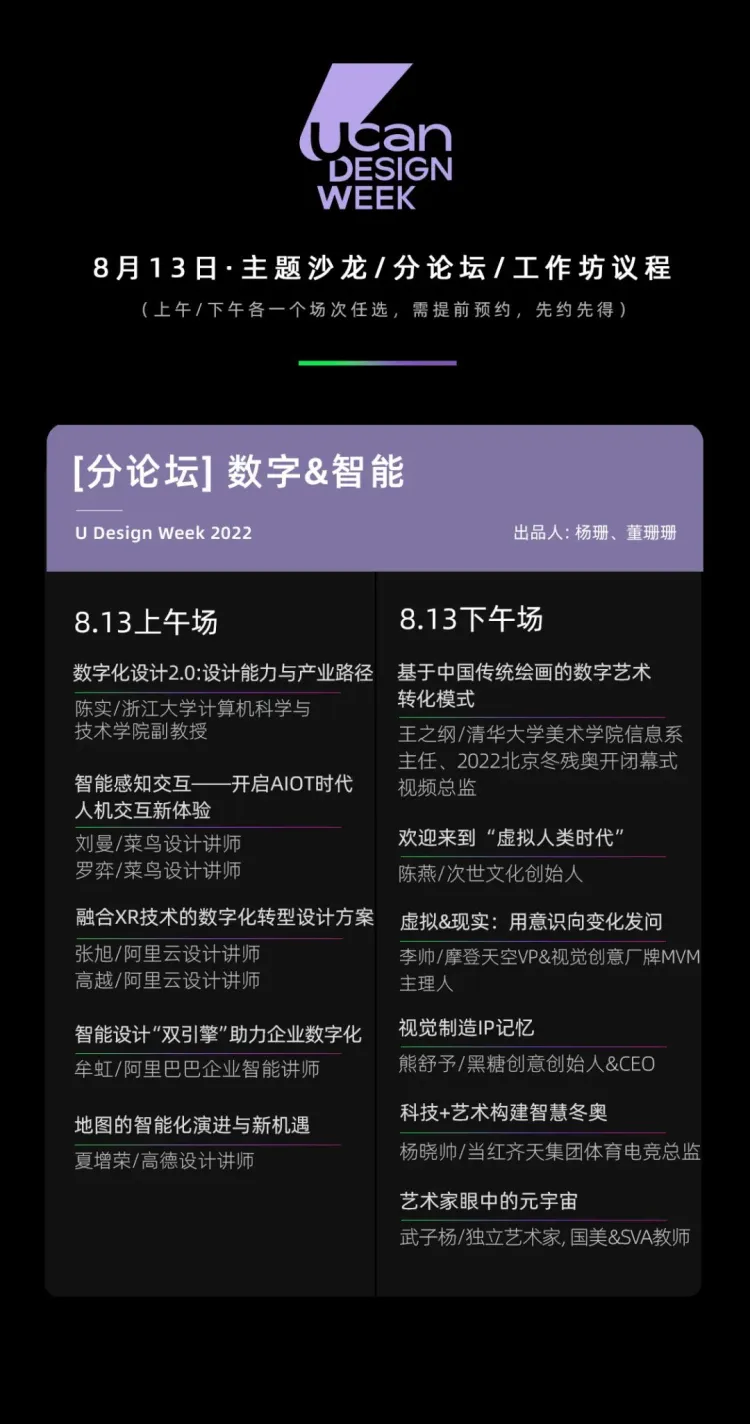 专业论坛由主论坛、分论坛、工作坊、主题沙龙构成,面向对设计趋势感兴趣的普罗大众,内容涵盖新支付体验,疫后自我重启、智慧城市、智能出行、z世代养老、数字nft等;主论坛嘉宾也超越传统设计领域,包括2022北京冬奥会开幕式视效总监王志鸥、MAD建筑事务所马岩松、日本建筑师本间贵史、著名演员兼建筑师吴彦祖、电影导演Liam Young、上海当代艺术博物馆馆长龚彦、中国歌剧舞剧院首席服装设计师阳东霖等不同领域的大咖,将碰撞出更多智慧的火花。