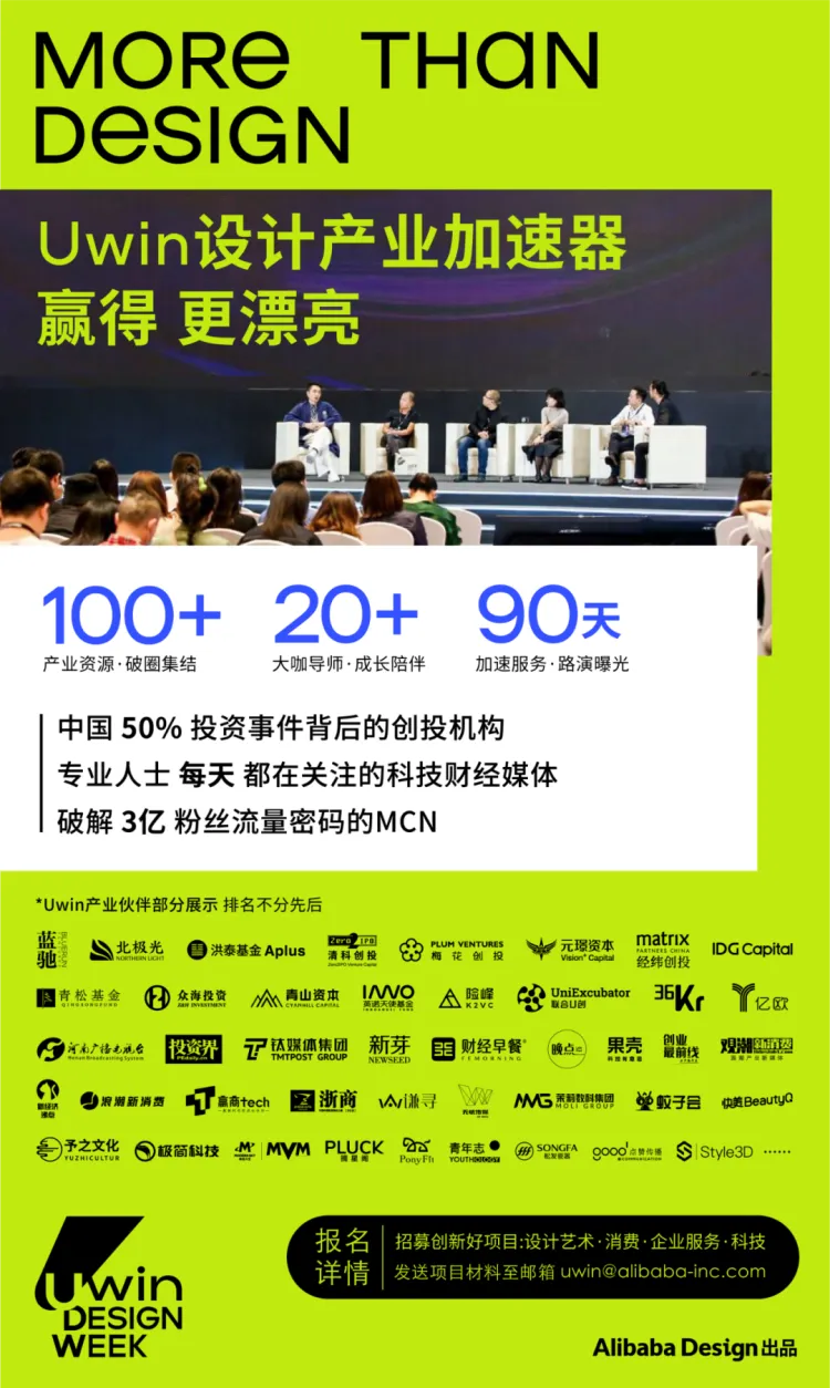 Alibaba Design 基于数字化能力沉淀和商业连接,开放设计专业能力,协同知名创投机构、科研单位、媒体、MCN、专业服务商、供应链、零售商等产业伙伴,以加速器的形式,助推正在创新路上的好项目赢得更漂亮。Uwin第一期,将入围20+创新项目,开启90天加速,将于8月14日在U设计周舞台呈现首场路演。报名方式:发送项目材料至邮箱uwin@alibaba-inc.com。