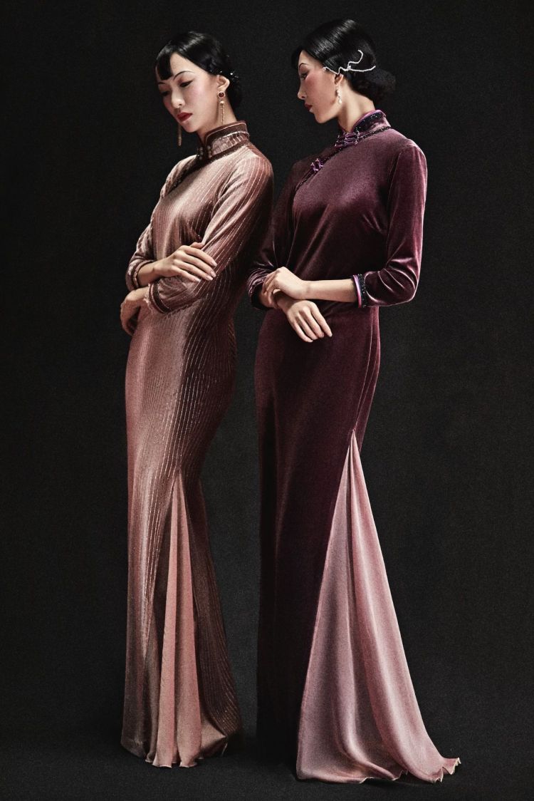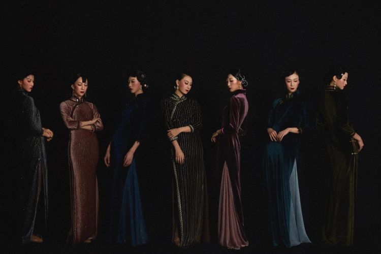 我们实地去了上海,走遍了大街小巷,进到弄堂来,也去了各种各样有上海记忆的地方,你会发现(舞剧中)这群女子,她也许就是石库门里的清晨的一缕清烟,是一缕这种潮湿的空气中缓缓升起的,很柔和的一股烟,也像是清晨里上海女子在用扇子烧煤炉,给家人做早餐,承担起了家庭责任的人。她身上所拥有的这种情愫是柔和的,是不争不抢的,它不是外放的。我觉得这一段我们更多找的是这种生活气息,像一缕清烟的感受。所以我们用了一个普通人穿旗袍不会用的烟灰色,但你会发现这样的颜色搭配丝绒的面料,呈现出了不一样的感受,因为旧上海的旗袍很多都会用丝绒。其次它会用很多条纹,是民国时期上海旗袍的一种记忆,那么我们把这些元素融合在一起。你会发现它呈现出了一个独特的审美气息,很不一样,其实我们往往是在找这种看似熟悉,但是又很陌生的感受。你会觉得好像生活中谁也不会去穿的衣服,但是它放在那样一个语境里,那样的一个场合里,那样一个戏剧环境里,它就很合理。