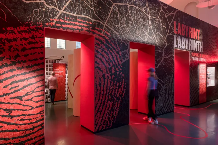 据策展人皮帕·尼森(Pippa Nissen)所说,团队从书名获得了灵感,“迷宫”是这个展览的核心主题。迷宫意味着只有唯一出路、读者在阅读这本书时脑海里的思考路径,也是一种困在谜题之中的隐喻。为了具象地呈现这种推理的过程,他们模仿推理电影中常用的推理工具——红线,勾连起六个板块的展览内容,串起不同的图文资料。