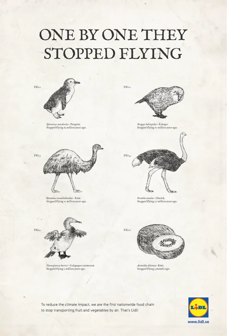 “它们一个个都不会飞行了”——海报的标题说既是说图中的这些鸟类动物因为翅膀退化而不会飞了,也说的是LIDL公司停止使用空运,是一家“不会飞”的公司,图1-5是不会飞的鸟,而图6是不会被空运的猕猴桃。