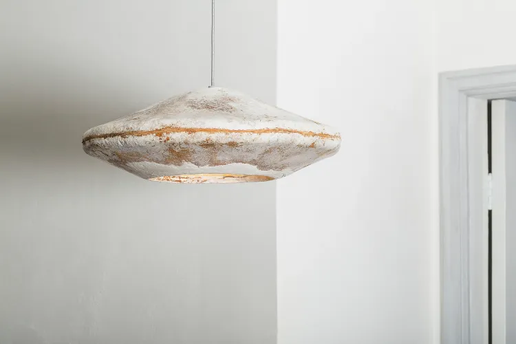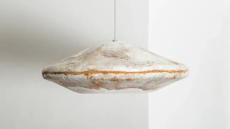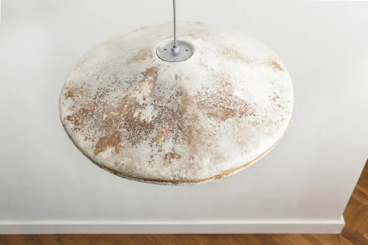 灯罩制作完成后配上照明电缆和陶瓷插座才真正成为了一盏灯。B Wise的直径约有60厘米,但重量只有3公斤,其手感十分柔软,宛如一朵漂浮的蘑菇,白、棕斑驳的颜色是菌丝自然生长的结果,和蘑菇表面的花纹很类似,无论是从材料还是外观上都可以说B Wise是一盏名副其实的蘑菇灯。