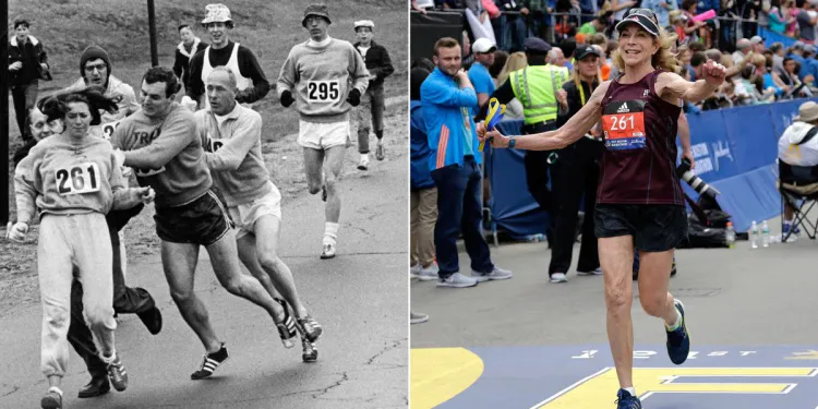 一年后,1967年4月19日,热爱跑步却不被教练认可的凯瑟琳·斯威策(Kathrine Switzer)也坚持要参加波士顿马拉松,并用“K.V.斯威策”的名字注册报名,一开始并未引起关注。然而,当发令枪响起后,凯瑟琳很快就成为了众矢之的,赛事工作工作人员和其他选手冲向她,企图阻止她比赛并撕掉她的编号261。