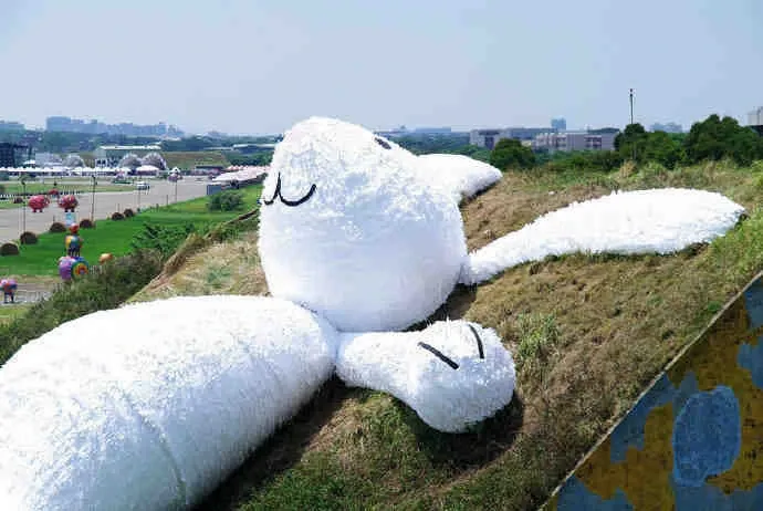 他也为台湾设计过一只“月亮兔”(moon rabbit),灵感来自于玉兔传说。这只兔子惬意地靠在一个长满草的滑坡上(据说原本是军事所用的掩体,所以并不是任何地方都有如此的斜坡形状),凝视着月亮。观众很容易顺势躺下来,顺着它视角注视天空,一同沐浴月光。