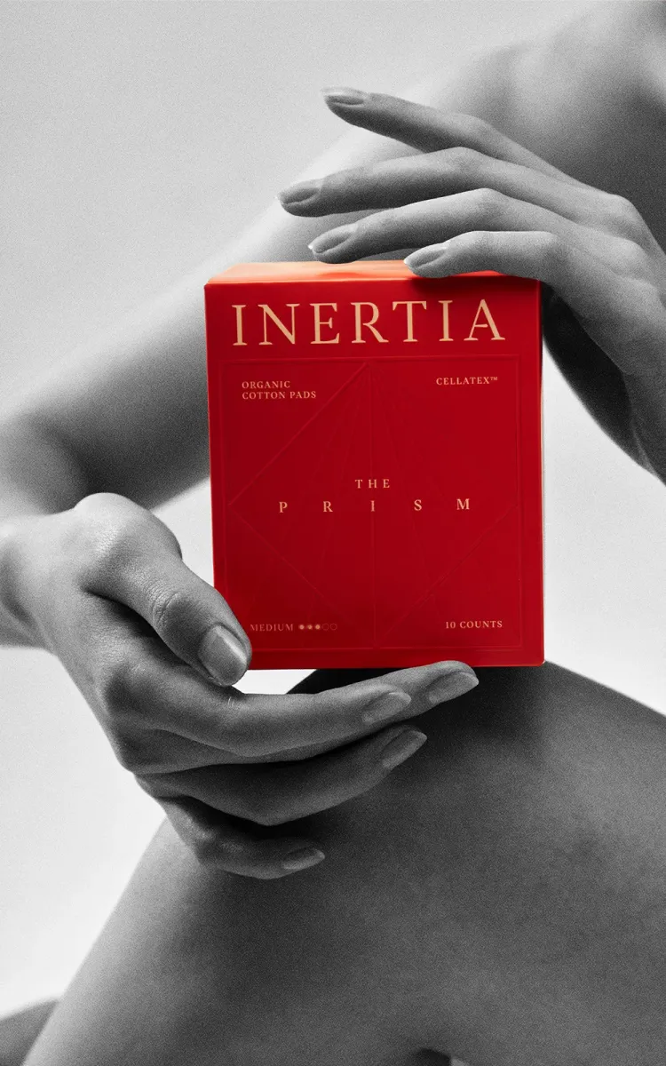 除了技术的创新,INERTIA在外包装上也下了不少功夫。她们大胆地以大红色作为基调,辅以简洁锐利的棱镜花纹,再加上充满未来感的摄影风格,使得这套包装尽显优雅高级,一扫传统卫生巾的花里胡哨之风。