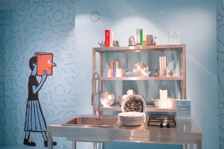 「文学世界」板块由Sarah Andelman精心选书和选品,通过不同小主题结合书与非书,如在气味文学区为不同的作品匹配了相应的香氛产品,厨房主题的空间陈列了餐具和相关作品,又或者是挑选出一些和文学、书写有关的精品,如铅笔形状的陶瓷装饰品、书形首饰盒等等。