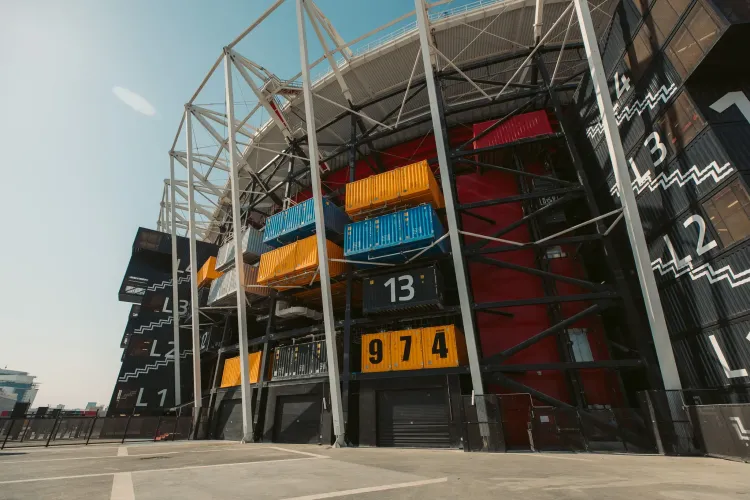 最终落地的方案由西班牙芬威克·伊里巴伦建筑事务所(Fenwick Iribarren Architects)、德国施莱希工程设计公司 (Schlaich Bergermann Partner)和希尔森·莫兰工程咨询公司(Hilson Moran)联手承建,选址定在多哈港附近,采用模块化设计,由974个海运集装箱和模块化钢架组成,因而得名“974球场”。如此设计,一来可回收再利用,二来“974”也是卡塔尔的国际区号,使用集装箱则是呼应了多哈的海航产业传统,均具有象征意义。
