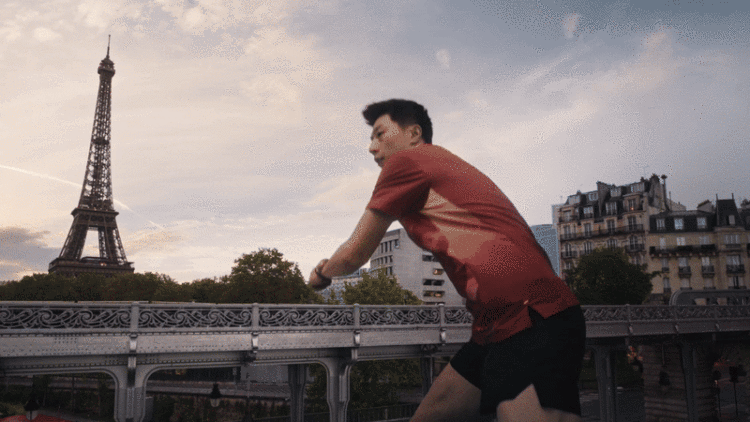比尔哈姆桥成了我们中国运动员马龙的乒乓球桌,埃菲尔铁塔成为他挥洒汗水的背景:
