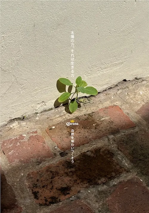 系列海报以东京的混凝土建筑为背景,捕捉那些穿过砖缝、破石而出、顽强生长的植物,借由它们旺盛的生命力,发出「太阳之力,就是生命之力,尽情品味自然吧」的呼吁。