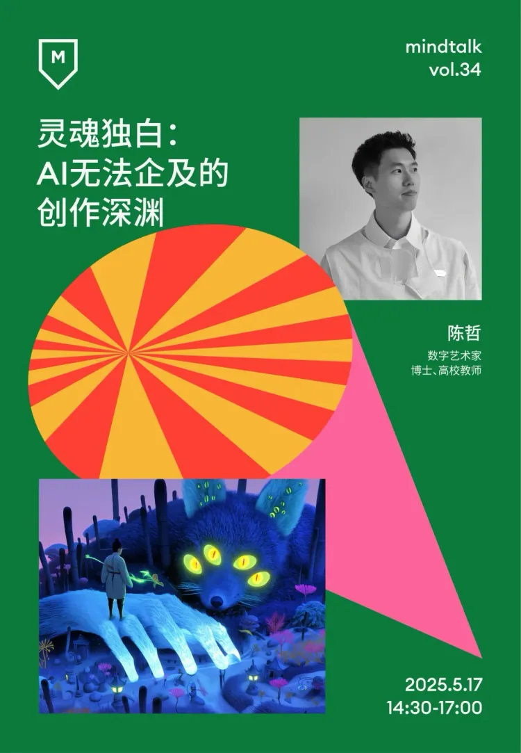 这次MindTalk,陈哲将以《灵魂独白:AI无法企及的创作深渊》为主题进行分享,探讨人类创作与AI技术的本质差异。