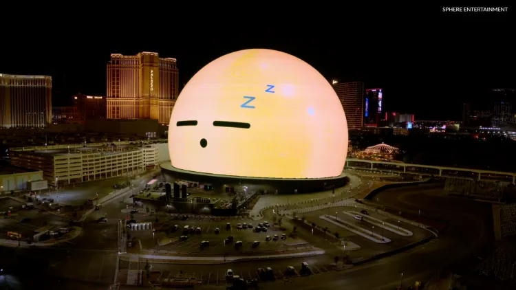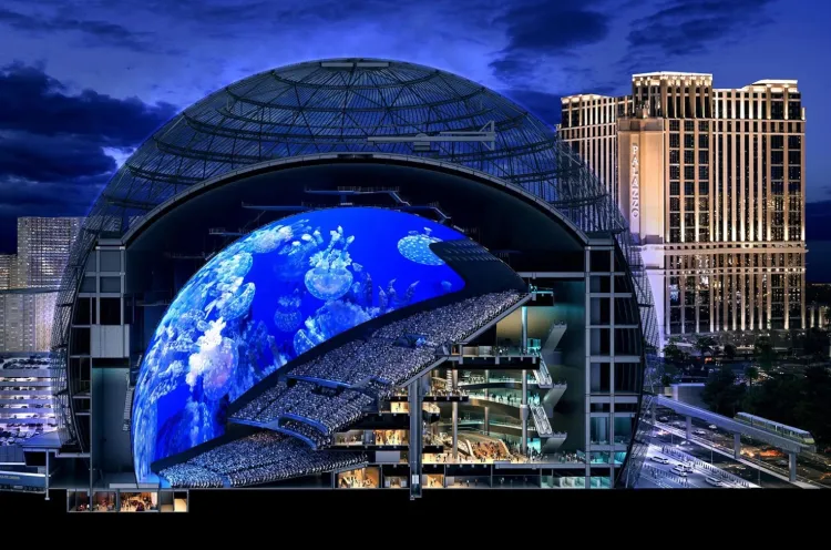 起初人们更关注的是它所在的MSG Sphere。这是拉斯维加斯打造的巨型体育场,花费4年修建后,在2023年7月,庆祝美国独立日的当晚正式亮相。当球形大屏首次亮起,超过120万个LED圆盘共同组成动态图像闪烁变换,科技感十足。