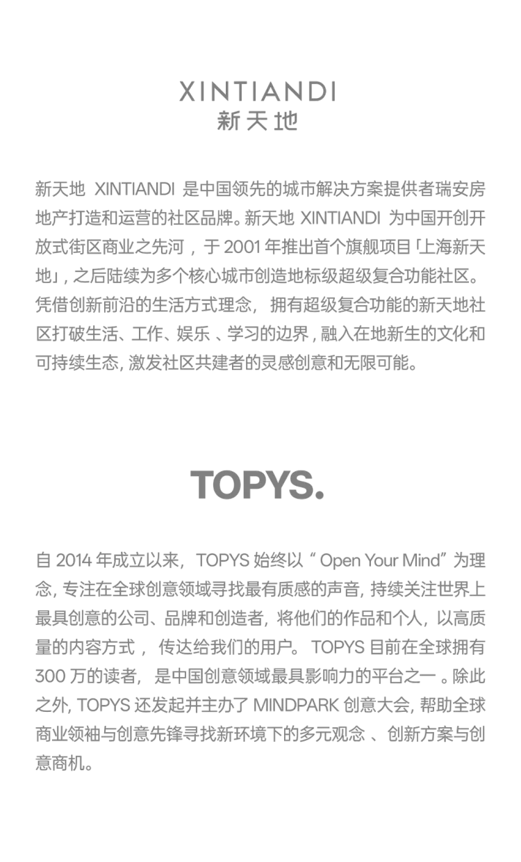 从“需要做”“应该做”到真正“做出来”,步骤虽清晰,道路却并不轻松。“破界”是本次大会的主题,也是我们给自己的命题——新天地XINTIANDI与TOPYS的携手,本身就是一重“破界”。