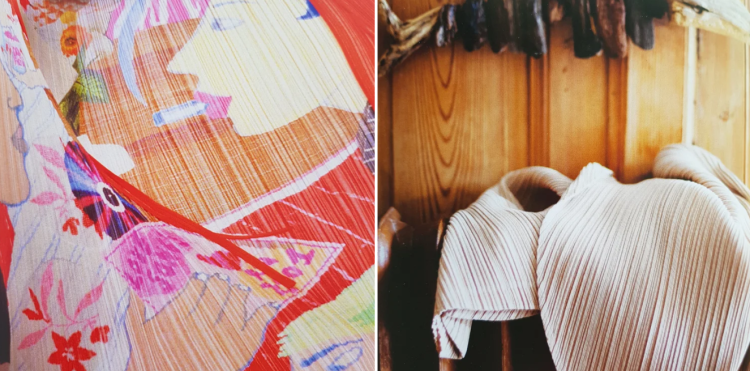 关于“包裹”的设计思考,色部义昭也进行了举例说明。现场,他们展出了三宅一生(ISSEY MIYAKE)经典的“PLEATS PLEASE”系列。