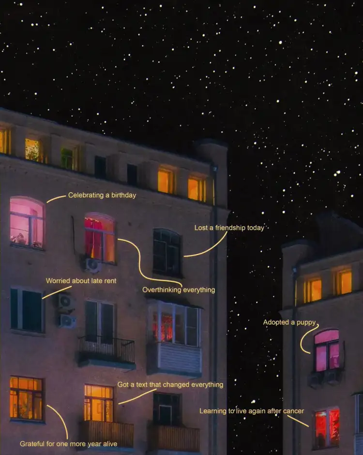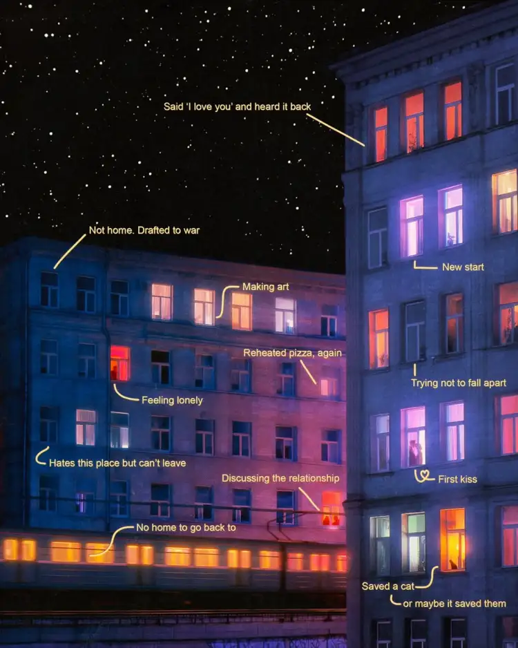 几个月前,艺术家Roger Mattos将这种熟悉的感受视觉化,他以摄影师Evgeny Larin拍摄的实景图为基础,缀以简单的文字,让我们重新发现:同一时刻,每扇窗后,都在上演不同的人生剧目。真实又梦幻。