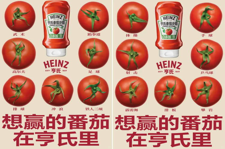 广告出自创意热店Heaven&Hell之手,内容非常简单:亨氏番茄酱的核心原料——番茄——每颗番茄蒂化作一位“运动员”,齐齐整整34个,对应全运会的34个比赛项目。广告语“想赢的番茄在亨氏里”,既点出了亨氏番茄的好品质,也呼应了全运会的体育氛围。