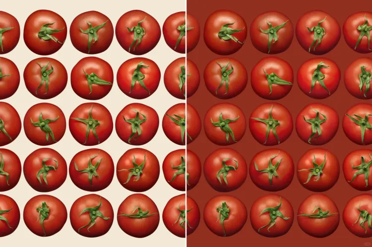 34颗红艳艳的大番茄齐齐整整,足具视觉吸引力,但因为画面整体上简洁干净,又不会让人觉得眼睛好吵的感觉。而每个番茄蒂的各异形态,又让它们经得起细看。