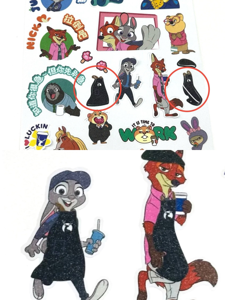 不过瑞幸巧妙地钻了个空子,发放的联名贴纸上不仅有朱迪和尼克,还有和他们身形一模一样的瑞幸围裙,暗戳戳地邀请消费者给角色们“换装”。为了减少违和感,围裙没采用通用的白边,而是特意做了黑边处理,被网友锐评“心机瑞”。