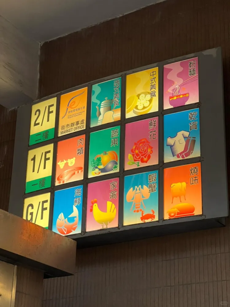 在花园街街市,食材变成简洁可爱的卡通图标:面条、茶杯、鱼虾、螃蟹……图像简单,却非常有效,像一本摊开的“市井说明书”。它解决了一个基础而现实的问题:在多语言并存的环境里,图像比文字更直接。行人就算不认识字、不懂粤语,只要顺着图标走就能找到想去的区域。