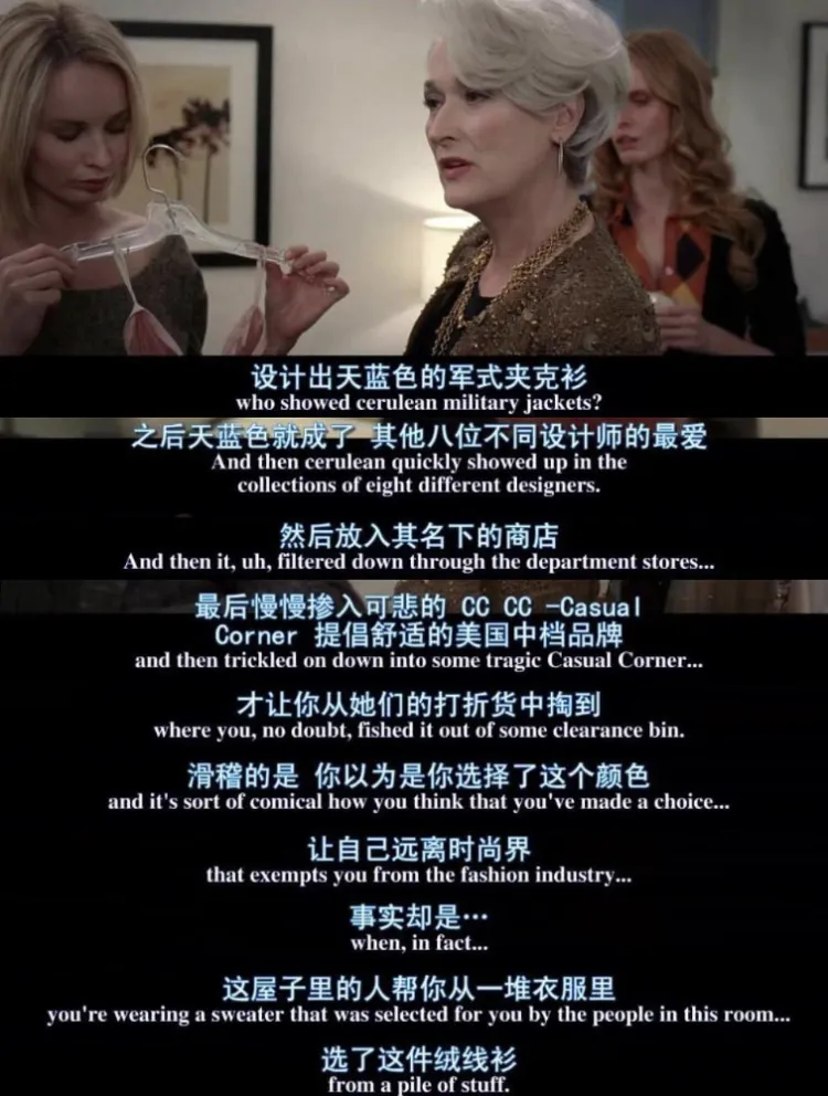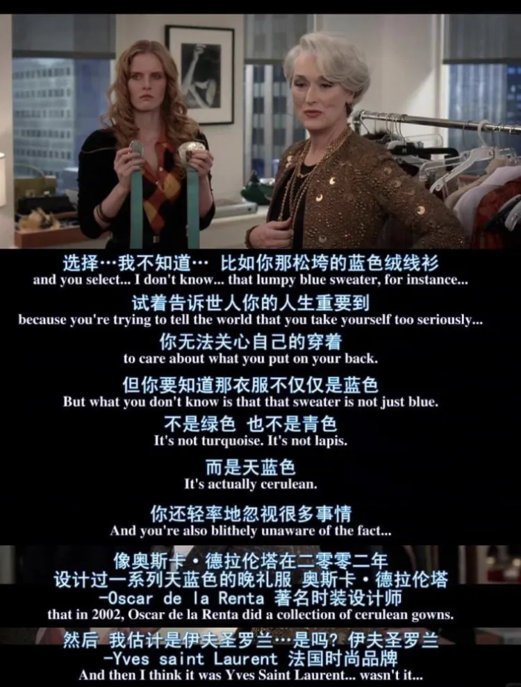 不久后,iMAC推出了类似颜色的版本,三星在诸多产品中频繁使用这种蓝色。2006年上映的电影《穿普拉达的女王》中,主编更以安迪身上的蔚蓝色毛衣为例,讲述潮流是如何从顶端渗透进每个人的生活的。