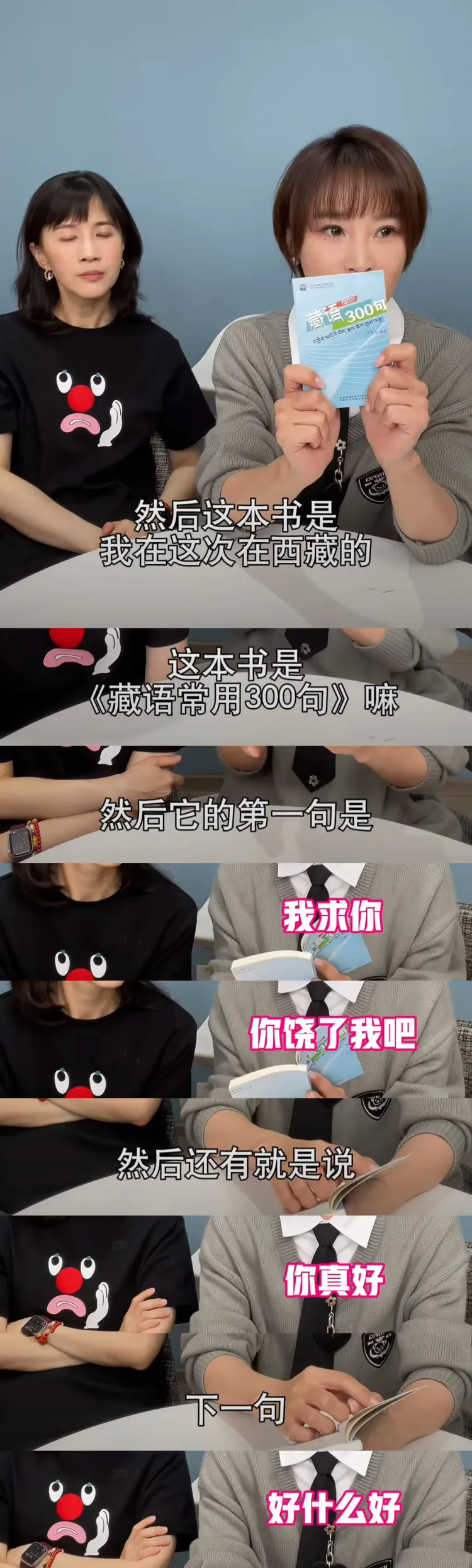 再比如主持人谢楠,带来一堆看起来像是拼单上瘾才会购买的奇怪玩意儿。海豹形状的涂改液,写着“本宫乏了”的眼罩,教你说“你真好、好什么好”的《藏语常用300句》……她介绍好物的状态就像小女孩分享自己淘到的玩偶,遇到同好更是有种相见恨晚的激动,让观众直观感受到她的古灵精怪。