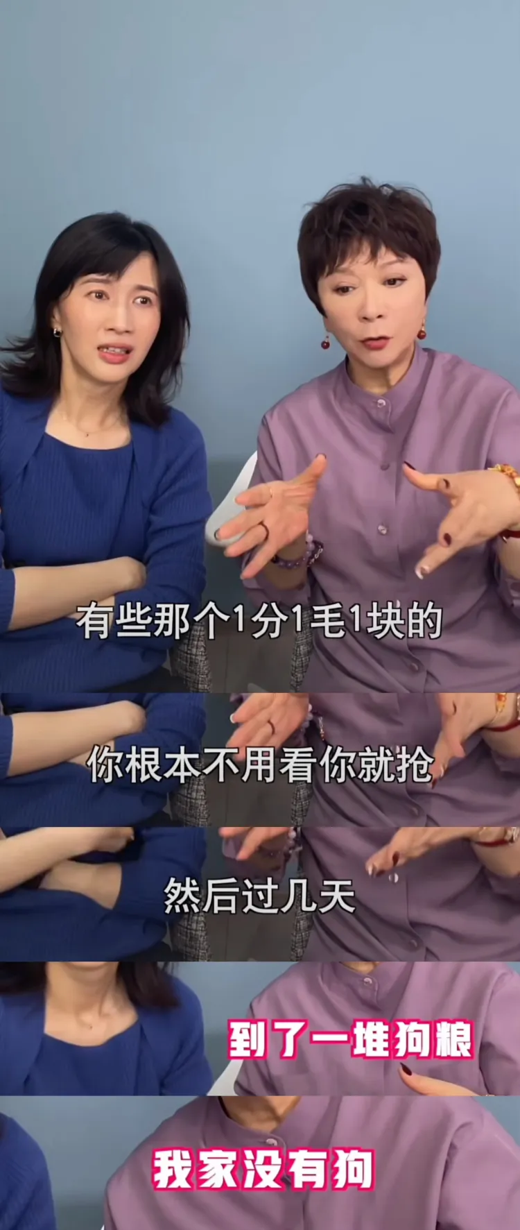 蔡明来录的第一期节目,更是可谓“梗上长了个人”。从她的开场白“很高兴来到papi直播间”开始,事情就朝不可预料的方向发展。这位花甲之年的老艺术家沉迷于抢直播“福利”,不管卖什么,看到有折扣就下单还专门设置了免密支付,结果到货一看是狗粮,但“我家没有狗”。