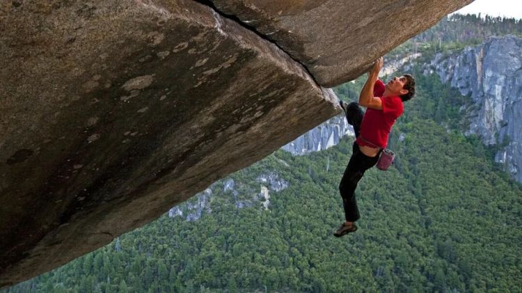 所谓徒手攀岩,就是孤身一人、且不使用任何保护设备。听起来既令观众捏一把汗,又可以无痛享受肾上腺素的飙升。然而这个纪录片并不是Alex Honnold挑战酋长岩攀登的直播,相反,在前面八十分钟,镜头展示的都是Alex普通人的一面,在房车里生活和锻炼,和女友的情感波动,正式攀登前一遍遍的路线测试。