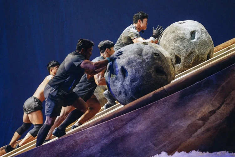 比赛环节设置宛若“酷刑”,选手们要么如西西弗斯般无止境地滚动100kg的石球,要么双手各拉100+kg的石像承受被撕裂的重力,1v1肉搏夺球、吊环2h+......这还只能算是入门级别的。