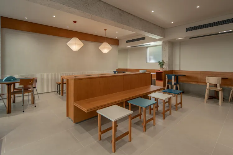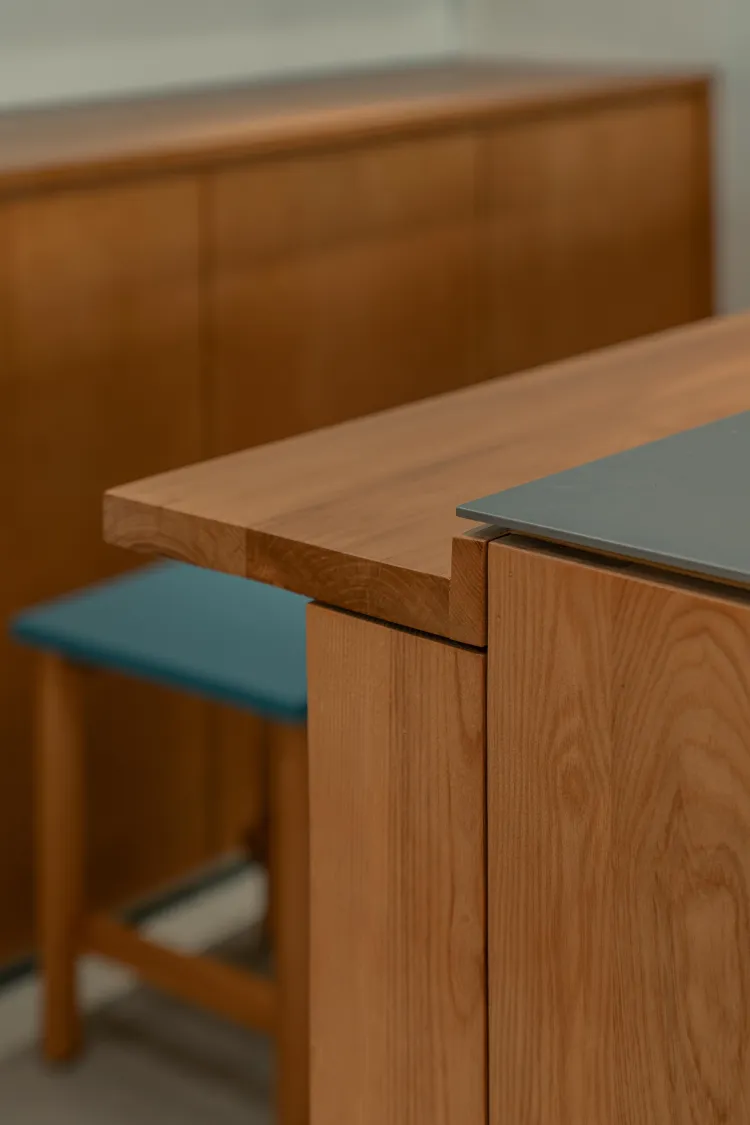 因此,华熙在设计时重点选择了天然石材和实木等自然传统但应用难度较高的材料。实木容易热胀冷缩,则拆分板材进行拼接;实木有一定厚度,因此点餐台采用海棠角,可以看到木纹的横截面;前吧台则通过交错的咬合结构,微微高出一截以遮挡设备电线。