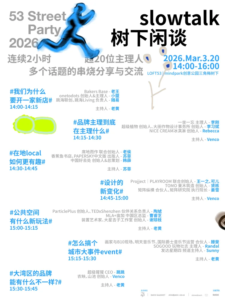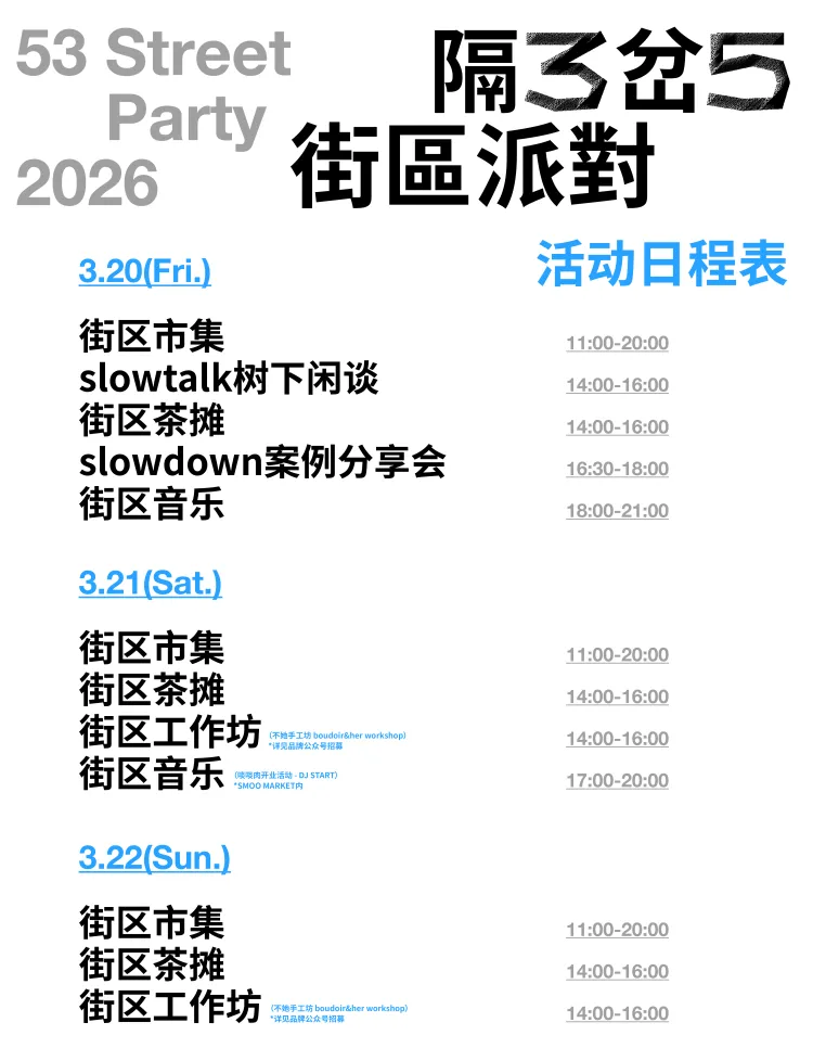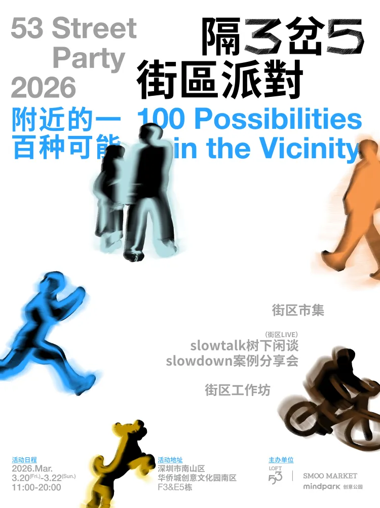 此外,3月20日至22日(本周五至周日),PROPOSER提案者书店所在的LOFT53街区,将举办周年庆活动—— 「隔3岔5街区派对2026」,开展街区市集、街区工作坊、slowtalk树下闲谈等活动,一起探索附近的一百种可能。如果你对“附近”感到好奇,希望感受久违的、松弛温暖的邻里状态,更要来这里看看!