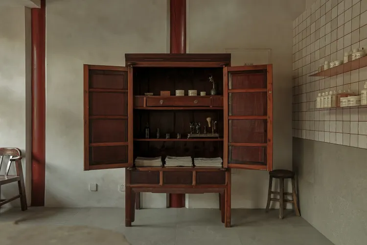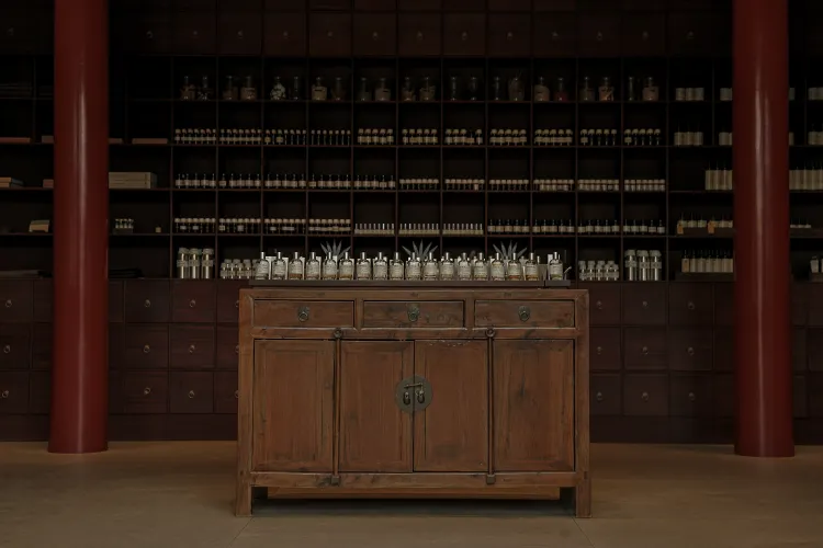 品牌二十周年,也恰好是这个空间的一周年庆。青砖黛瓦,传统中药房药柜似的陈列架,红柱上的裂纹和剥落的漆,悠哉哉溜达而过的店猫皇星星……这里符合大多数人对“老北京”的想象,也是一间非常LE LABO的店铺,带着时间的痕迹,浸透了所在城市的气息。