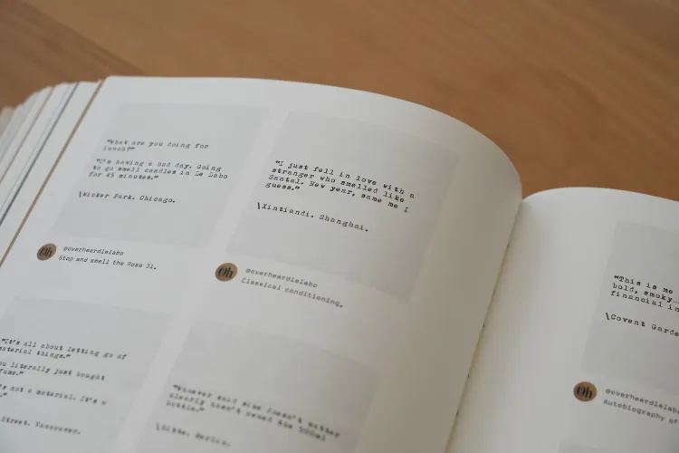 在Overheard LE LABO这章,你能再次领略这部“鲜活的数字化记录”中收录的,香氛带来的无形影响,以及在LE LABO门店和生活中藏满的细碎幽默——“买下这瓶香水吧,你能够负担得起。”“我可以吗?”“当你闻起来很成功,金钱自然就会来了。”