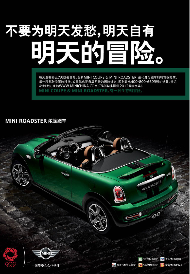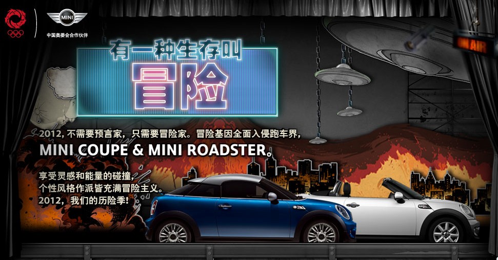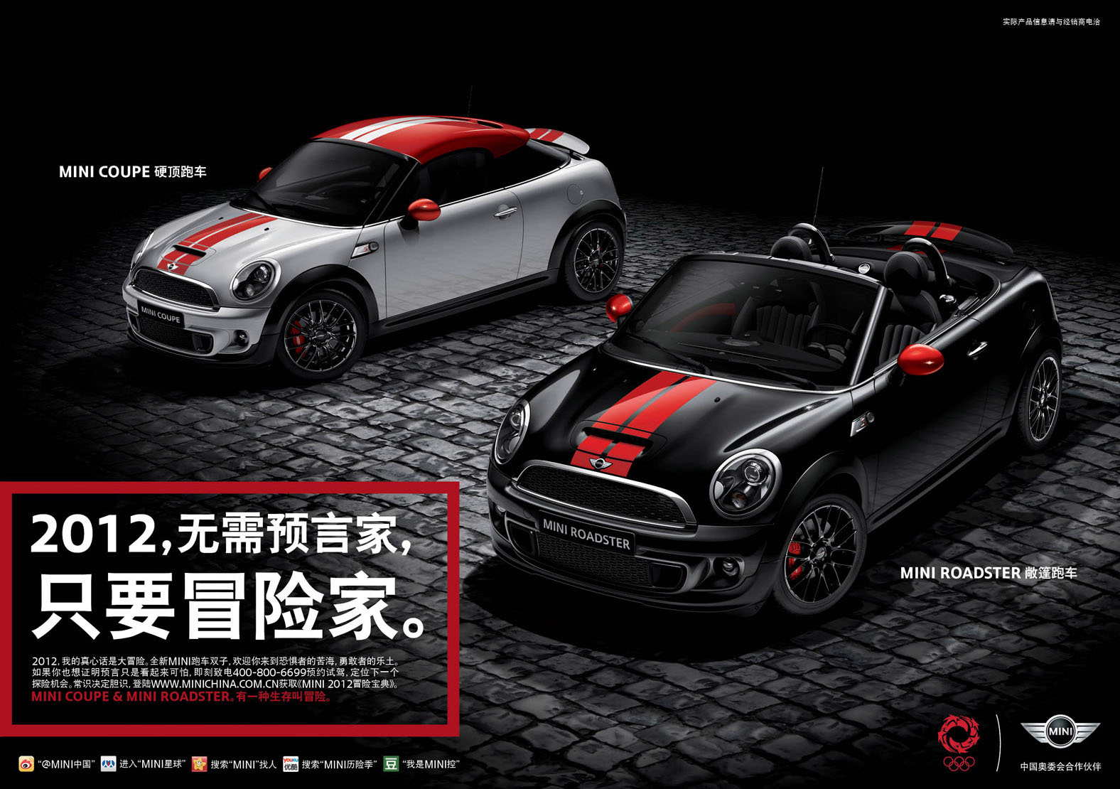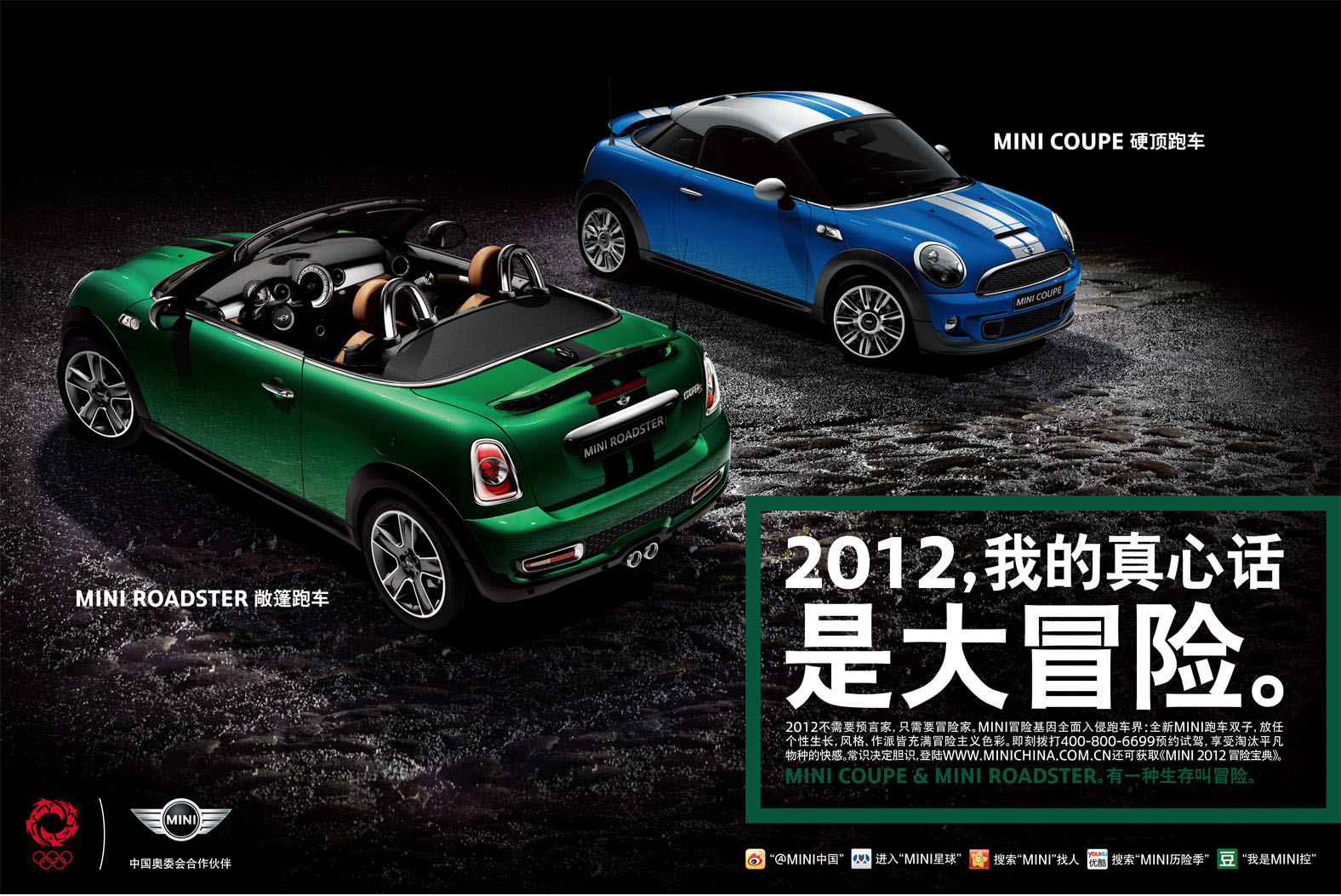 2012年2月2日,这样一个成双成对的日子里,MINI推出了全新的MINI Coupe & MINI Roadster的上市传播战役,本次传播主题为“有一种生存叫冒险”。联合了网络的各个平台,无孔不入地走进人们的视野,广告风格秉承了mini的风趣幽默,并利用今年这个特殊的年份,恶搞了一把2012世界末日预言,并教人们如何在各种灾难中上演华丽的生存大冒险。